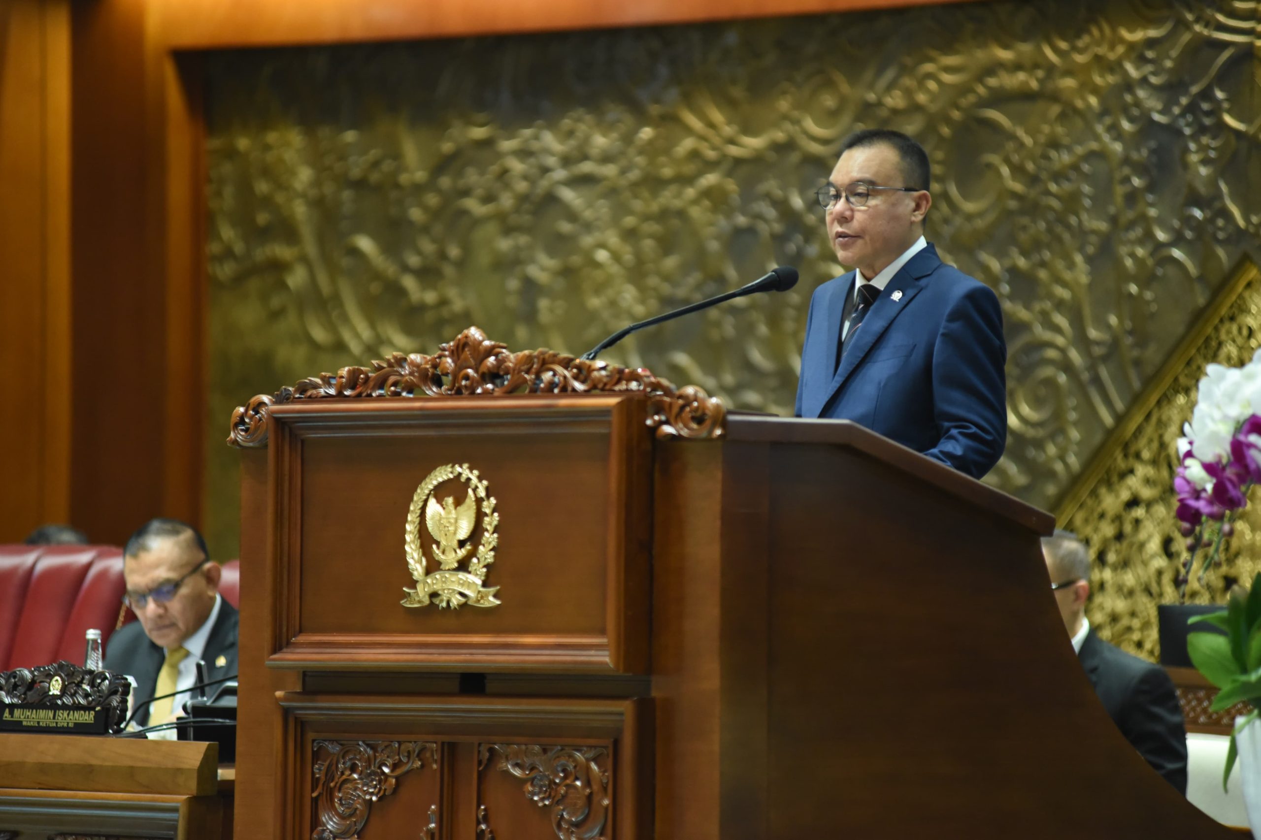 Wakil Ketua DPR RI Koordinator Bidang Ekonomi dan Keuangan Sufmi Dasco Ahmad saat membacakan pidato pada Rapat Paripurna DPR RI Pembukaan Masa Sidang IV Tahun Sidang 2023-2024 di Senayan, Jakarta,.