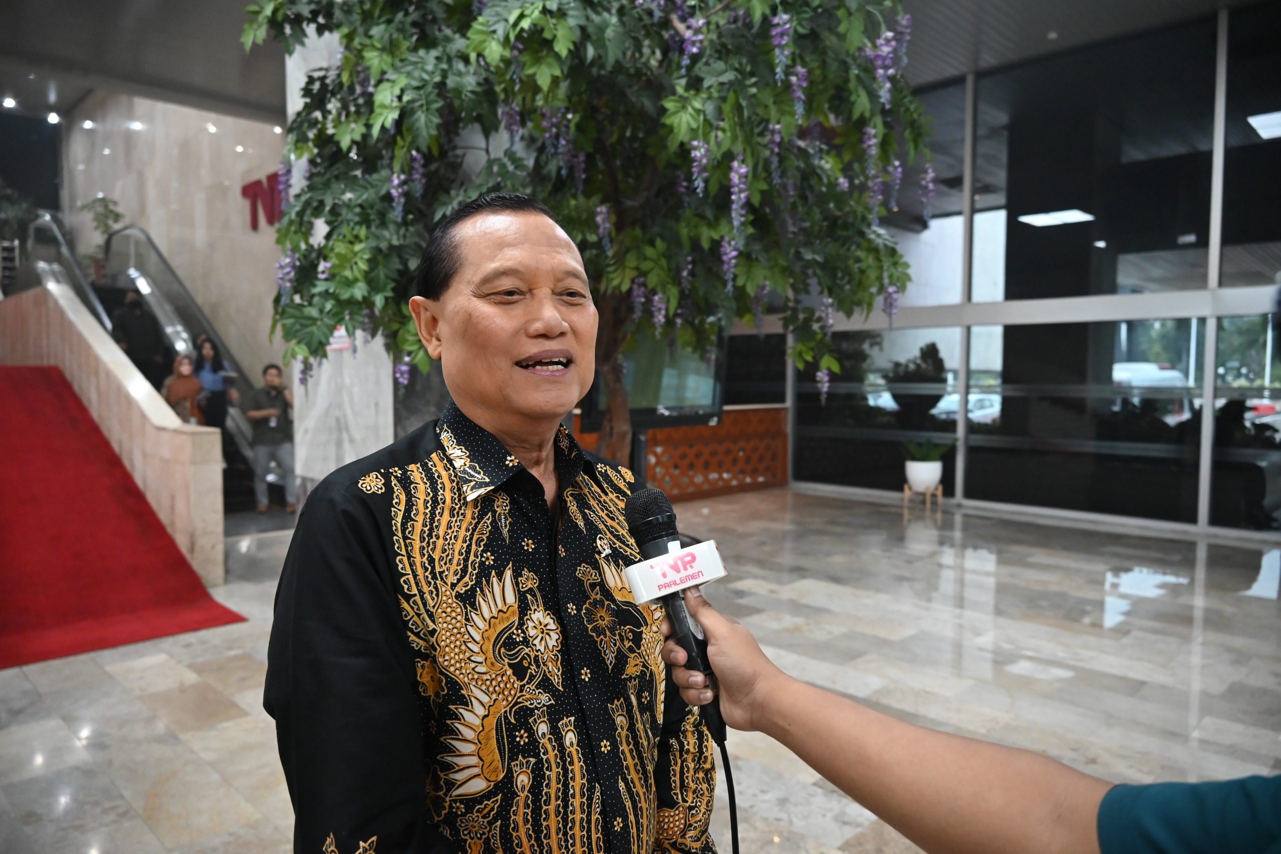 Anggota Komisi III DPR RI Adang Daradjatun usai menghadiri agenda Halal Bihalal bersama jajaran pejabat dan pegawai Sekretariat Jenderal DPR RI di Gedung Nusantara IV, Senayan, Jakarta, Rabu (17/4/2024). Foto:.