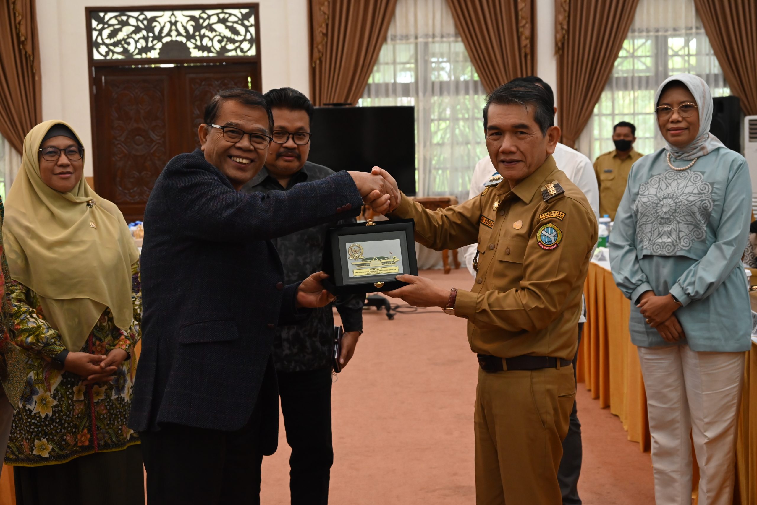 Anggota Komisi X DPR RI Adrianus Asia Sidot saat bertukar cenderamata disela-sela Kunjungan Kerja Komisi X DPR RI di Kantor Wali Kota Pontianak, Kota Pontianak, Kalimantan Barat, Senin (24/06/2024). Foto:.