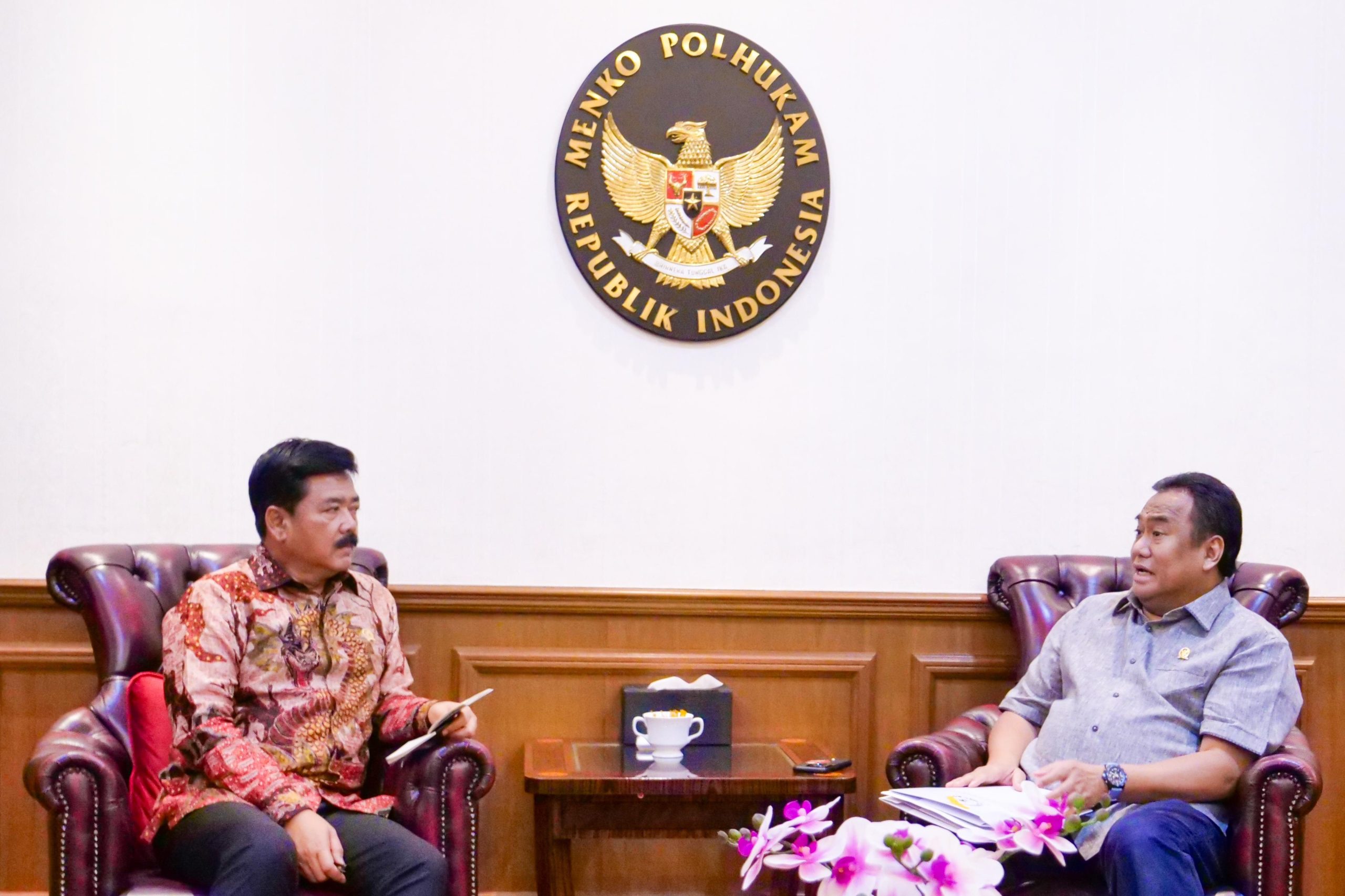 Wakil Ketua DPR RI Koordinator Bidang Industri dan Pembangunan (Korinbang), Rachmad Gobel (kanan) saat bertemu Menko Polhukam Hadi Tjahjanto di Jakarta, Selasa, (25/6/2024). Foto: Azka/vel.