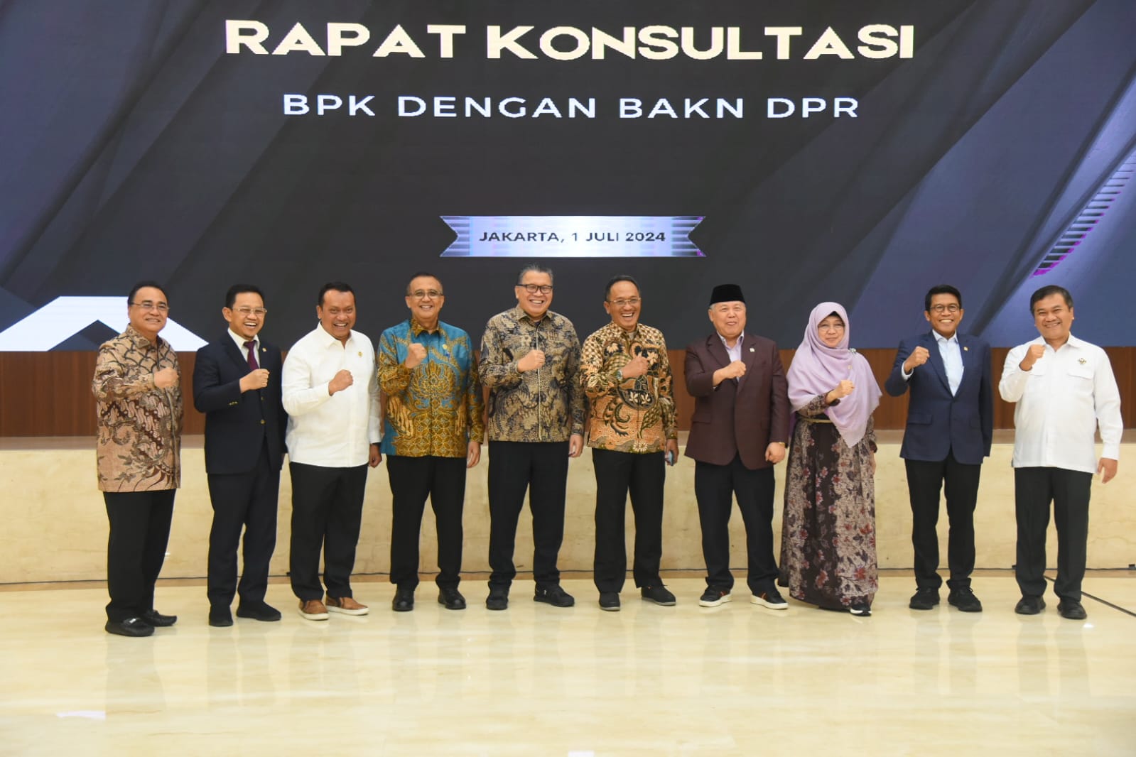 Ketua BAKN DPR RI Wahyu Sanjaya foto bersama usai pertemuan di Ruang Rapat BPK RI, Jakarta, Senin (1/7/2024). Foto: Runi/Andri.