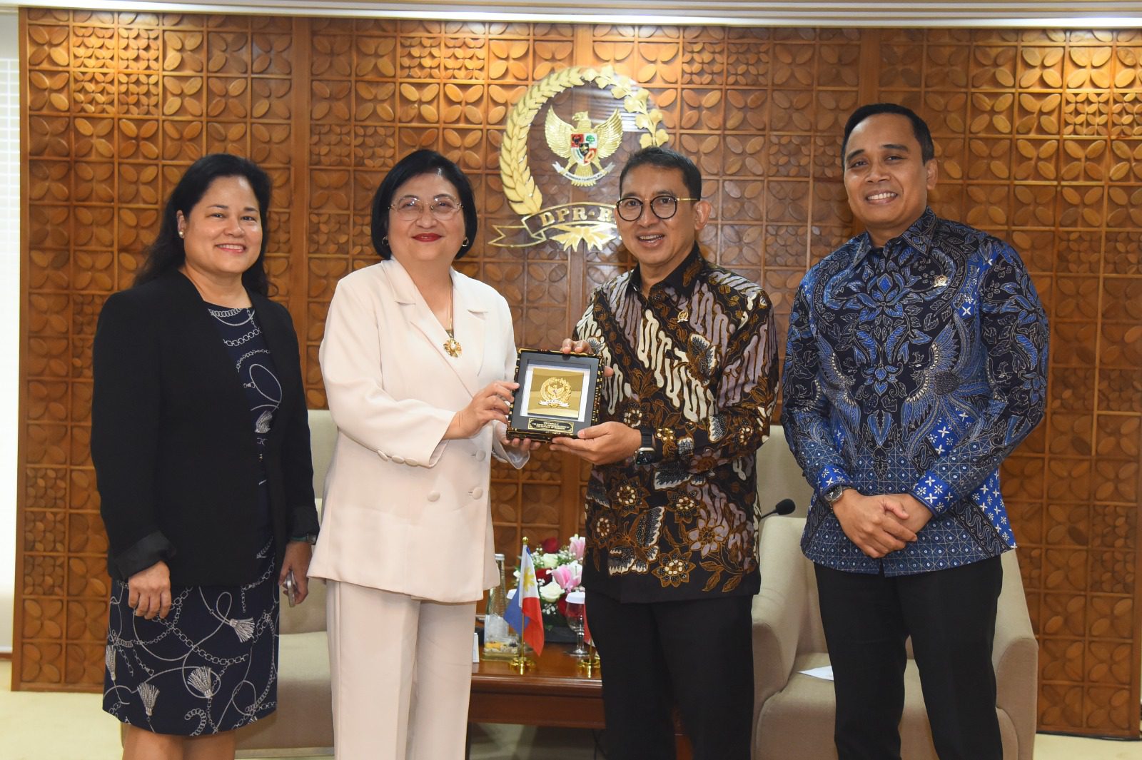 BKSAP DPR RI dipimpin Ketua BKSAP Fadli Zon bertukar cinderamata usai menerima kunjungan Duta Besar Filipina untuk ASEAN, di Ruang Dubes, Gedung Nusantara III DPR RI, Senayan, Jakarta, Selasa (9/7/2024).